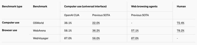 CUA在各项基准测试中表现不俗:WebArena(测试网页导航能力)上达到58.1%的成功率,在网页任务评测WebVoyager上达到87%的高分。虽然在操作系统导航测试OSWorld上的38.1%成功率与人类水平(72.4%)仍有差距,但已超越了其他公开发布的结果。官方表示,这些数据证明CUA在网页任务处理上已达到实用水平,但在复杂的操作系统交互方面仍需改进。