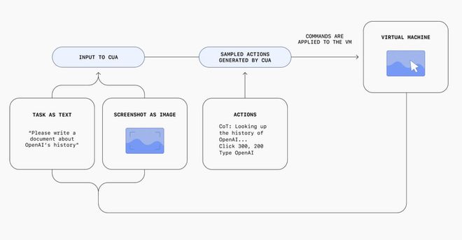 技术实现上,CUA采用了一个精心设计的感知-推理-行动循环。 具体的工作原理是:每次行动后,它会重新捕获屏幕画面,先将屏幕截图添加到模型上下文,通过GPT-4o的视觉能力准确理解界面内容,再依靠强化学习的推理能力(chain-of-thought)制定下一步计划,最后使用虚拟鼠标和键盘,精确执行点击、滚动或输入的界面操作,直到任务完成或需要用户输入。