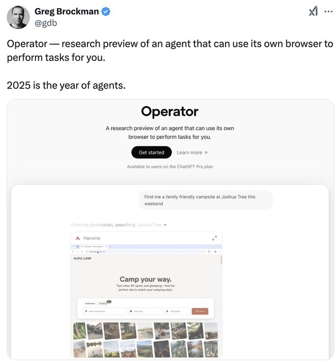 为确保产品体验,OpenAI已与OpenTable、Allrecipes、StubHub、Uber、Thumbtack、DoorDash、eBay、Target等多家品牌建立合作伙伴关系,共同探索AI Agent在各垂直领域的应用潜力,力求引领AI Agent领域进入全新的发展阶段。Operator发布后,OpenAI总裁Greg Brockman也随即转发表示:“2025年是AI Agents之年”。