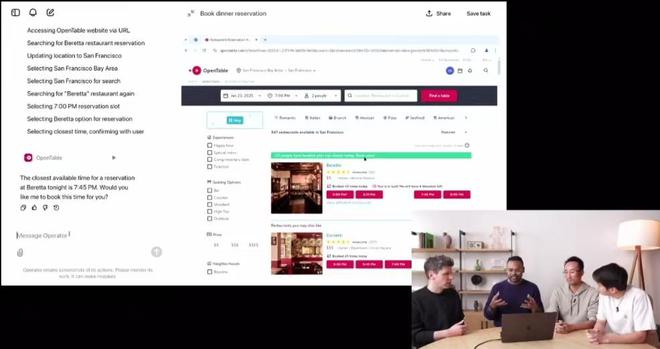 在20多分钟的介绍视频中,OpenAI演示了Operator如何用于处理各种复杂的网页任务,如填写表单、订购货物。在演示中,操作人员要求Operator预定某家餐厅傍晚7点的座位,Operator就会自动打开网页进入预订网站,搜索餐厅并完成预定。当Operator发现该时间点餐厅座位已经订完,就会询问用户是否改订7点45分的餐厅。如果上传一张写有鸡蛋、菠菜、蘑菇、鸡肉等食物的购物清单图片,Operator则会打开网页并搜索这些物品、加入购物车。Operator也能帮助用户订购外卖。