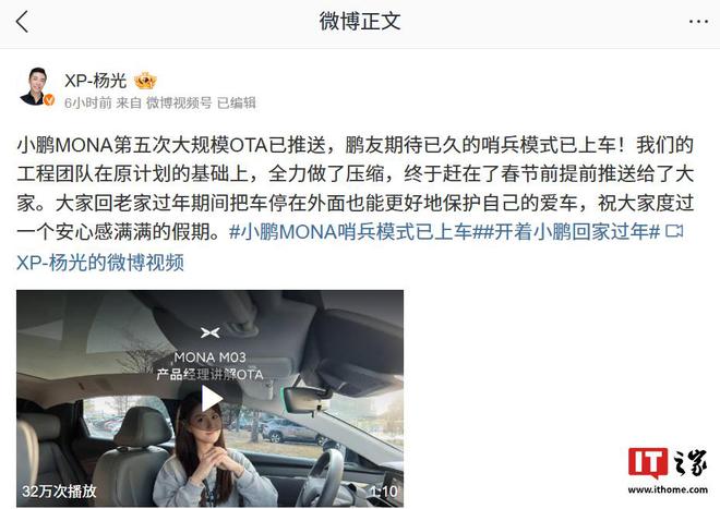 IT之家 1 月 24 日消息,小鹏汽车 MONA 产品负责人@XP-杨光 今日分享视频介绍了 MONA 车型的第五次大规模 OTA。他称“工程团队在原计划的基础上,全力做了压缩,终于赶在了春节前提前推送给了大家。”