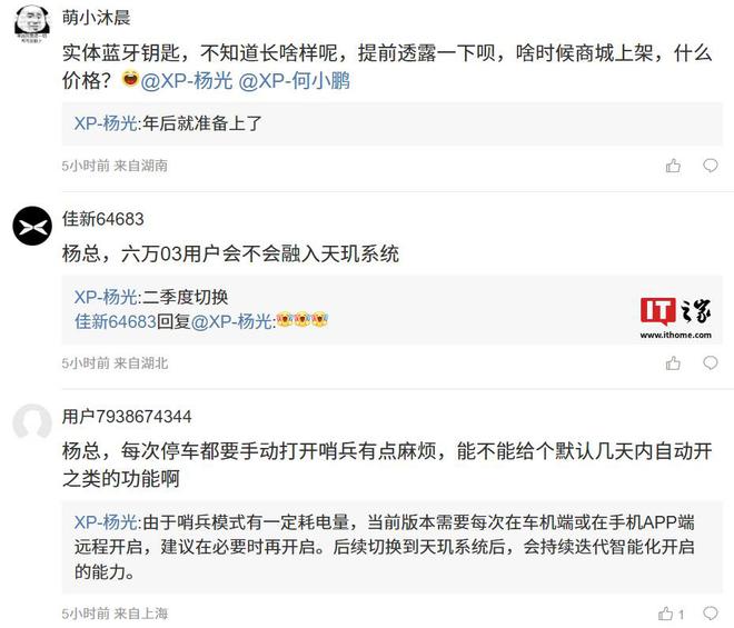 杨光还解答了部分网友的问题:针对该车实体蓝牙钥匙上市情况,他回复“年后就准备上了”;针对 MONA M03 车型是否会升级天玑系统,他表示“二季度切换”;针对哨兵模式能否提供自动开启的开关,他称“由于哨兵模式有一定耗电量,当前版本需要每次在车机端或在手机 App 端远程开启,建议在必要时再开启。后续切换到天玑系统后,会持续迭代智能化开启的能力。”