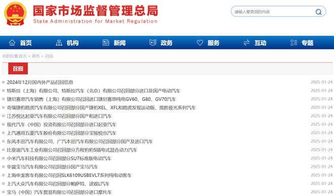 除小米汽车外,1月24日,特斯拉、比亚迪、上汽大众、华晨宝马等多家车企均召回部分型号汽车。