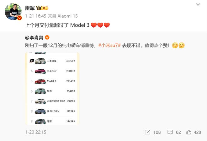 据小米汽车官方宣布,2024年全年小米SU7交付量超过13万台,顺利完成年度交付目标。1月21日,小米创始人雷军转发小米汽车副总裁李小爽发布微博,并称小米SU7“上个月交付量超过了Model 3”。