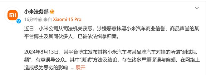 每经AI快讯,1月25日,小米法务部官博发文称,近日从司法机关获悉,涉嫌恶意抹黑小米汽车商业信誉、商品声誉的某平台博主及其同伙多人,已被依法缉拿归案。 2024年8月13日,某平台博主发布其将小米汽车与某品牌汽车对撞的所谓“测试视频”,有意误导公众。其中“测试”方法及结论,存在诸多严重谬误与偏颇,在网络上造成极为恶劣的影响,严重损害小米公司商业信誉。事件发生后,小米公司立即固定证据,开展法律维权工作,坚决捍卫公司合法权益。