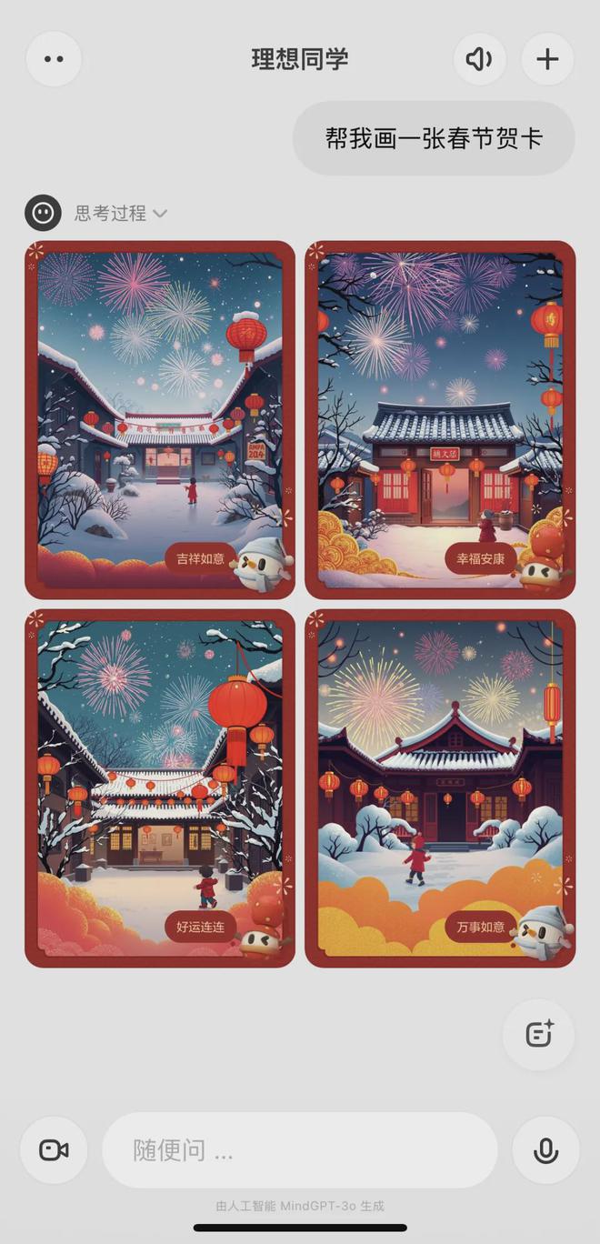 你也可以喊理想同学帮你创作一组祝福文案,画一幅画,比如生成一张春节贺卡。