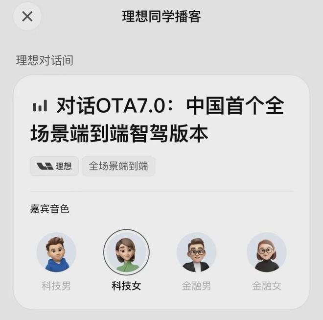 针对一些更专业、更深度的内容,光听AI语音很容易“走神”,理想同学还推出了行业首创的「播客」形式,与虎嗅、量子位等平台合作,将长篇优质内容转化为轻松有趣的两人对话,还支持主播音色选择。