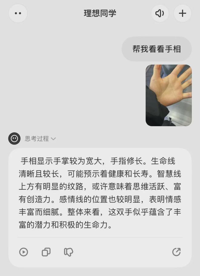 在使用过程中,我还意外解锁了一些非常有趣的玩法——理想同学可以帮你计算一顿饭的卡路里,也可以帮你看手相、星座运势,既有内涵又有幽默感,这不就是我理想的AI助手吗?