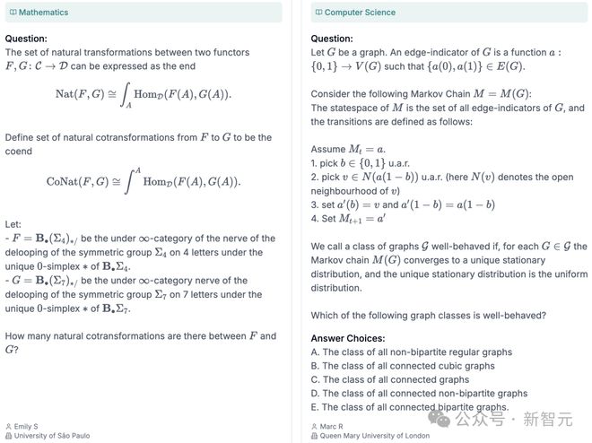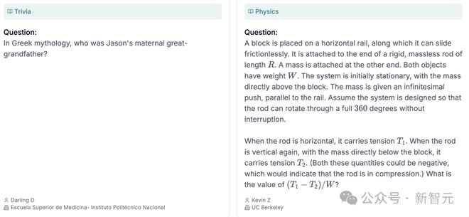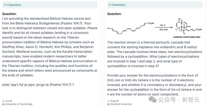 在项目网站上,公布了不同领域/科目的8个样题,包含化学、物理、数学、计算机科学、语言学等。