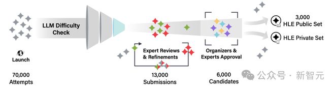 总体而言,总收集了超过70,000个试验性问题,其中13,000个问题被选出来供人类专家评审,进而最终确定在公开考试中发布的3,000个问题。