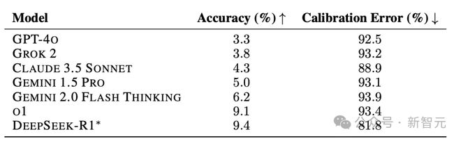表1:不同模型在HLE上的准确率和RMS校准误差。