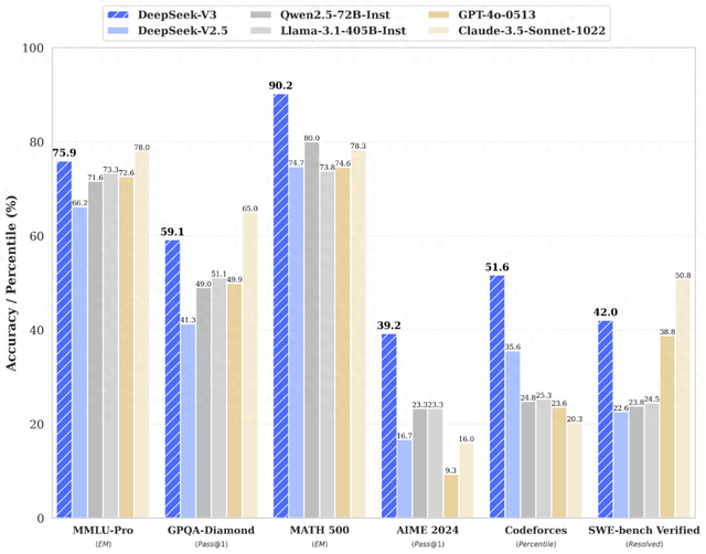 Deepseek-V3与多个国内外大模型的测试数据对比 “Deepseek”公众号