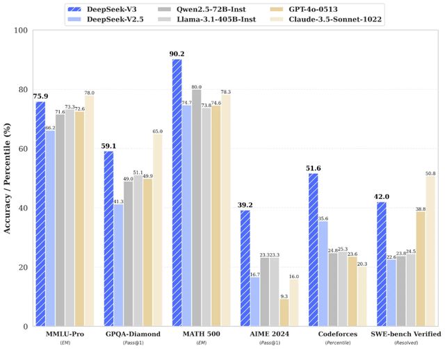 DeepSeek-V3多项测试成绩处于第一。