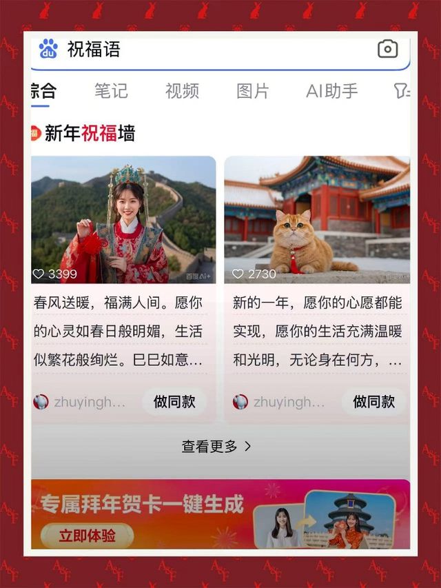 科技赋能,AI意满满。腾讯新闻推出AI新春对联,上线“新春送对联”互动H5,将AI生成的对联与京剧、兔儿爷、剪纸、景泰蓝等北京非遗项目和具有代表性的传统符号,及天坛、鼓楼、城市副中心三大地标建筑相结合,在送出美好祝福的同时,实现年轻化个性表达;抖音推出AI动画风格贺卡,在拍摄特效面板“春节”分类前排展示;百度运用文心大模型打造AI贺卡,在百度搜索新年祝福墙上,可以挑热门图片,定制春节祝福语,生成贺卡后可以对文字、图片等模版进行编辑,还可以一键祝福墙;快手“春节魔表”版块首位推荐,AI生成动漫风贺卡。