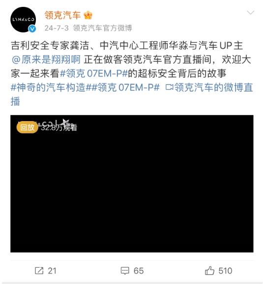 据领克汽车官方微博显示,2024年7月,吉利安全专家龚洁、中汽中心工程师华淼与汽车UP主@原来是翔翔啊做客领克汽车官方直播间。