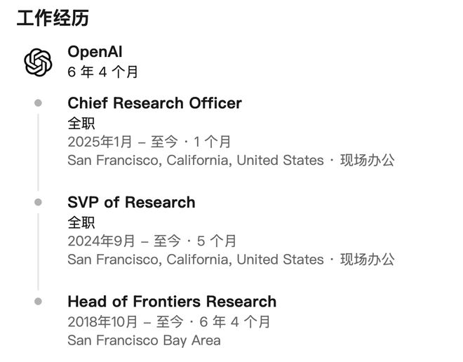 已经在OpenAI工作6年4个月,今天1月刚刚从OpenAI研究副总裁升任为首席研究