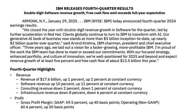 公司表示,其软件部门四季度收入同比增长10%,达到79亿美元,部分原因是对人工智能技术的需求以及其Red Hat Linux操作系统的强劲表现。CEO克里希纳表示,公司在其生成性人工智能业务中录得50亿美元的订单。