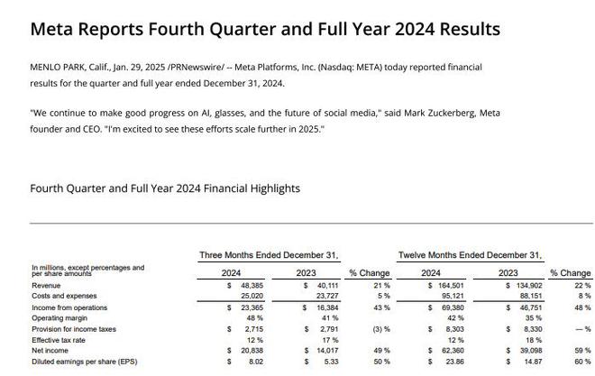 Meta Platforms 2024年Q4营收483.85亿美元,市场预期470亿美元,上年同期401.11亿美元。2025年第一季度收入预计为395亿至418亿美元,区间中点低于市场预期的417.3亿美元。