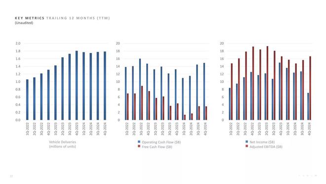 2024 年特斯拉全球销量十年来首次出现下滑,第四季度营收 257.07 亿美元,低于华尔街预期的 272 亿美元。第四季度净利润下降 71% 至 23 亿美元。