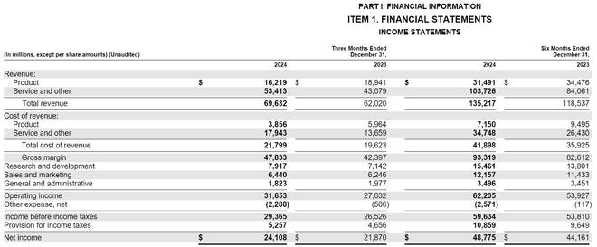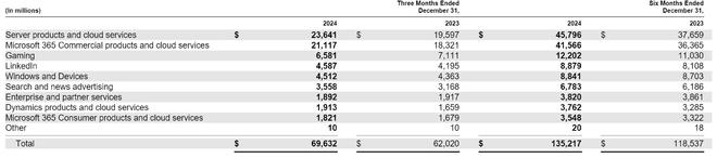 微软2024年第四季度来自企业和合作伙伴服务收入为18.92亿美元,较上年同期的19.17亿美元下降1.3%;来自Dynamics 产品和云服务收入为19.13亿美元,较上年同期的16.59亿美元增长15.3%;来自Microsoft 365消费产品和云服务收入为18.21亿美元,较上年同期的16.79亿美元增长8.5%。