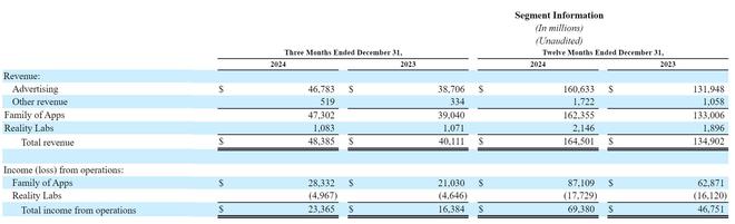 Meta在2024年第四季度来自Family of Apps的收入为473亿美元,上年同期为390.4亿美元;运营利润为283.32亿美元,上年同期为210亿美元;来自Reality Labs收入为10.83亿美元,上年同期为10.71亿美元;运营亏损为49.67亿美元,上年同期的运营亏损为46.46亿美元。