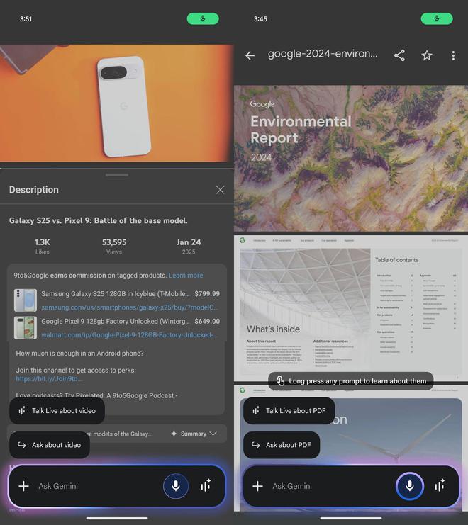 使用此功能非常简单,只需点击内容上方的 Gemini 浮动叠加层即可。如果是图片,则需要使用“加号”菜单上传或拍摄新照片。点击按钮后,用户将进入 Gemini 实时界面,即可开始关于该内容的聊天。
