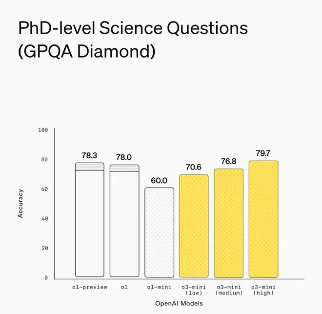 从能力上看,作为mini版本,o3-mini在一些测试中的表现略超o1。在数学测试AIME 2024、博士水平测试GPQA Diamond、竞赛编码测试Codeforces、软件工程测试sw -bench中,o3-mini得分分别为87.3、79.7、2130、49.3,高于o1的得分83.3、78、1891、48.9。