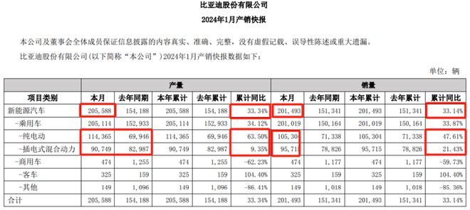2024年1月,比亚迪产量为20.56万辆,同比增长33.34%;销量为20.15万辆,同比增长33.14%。