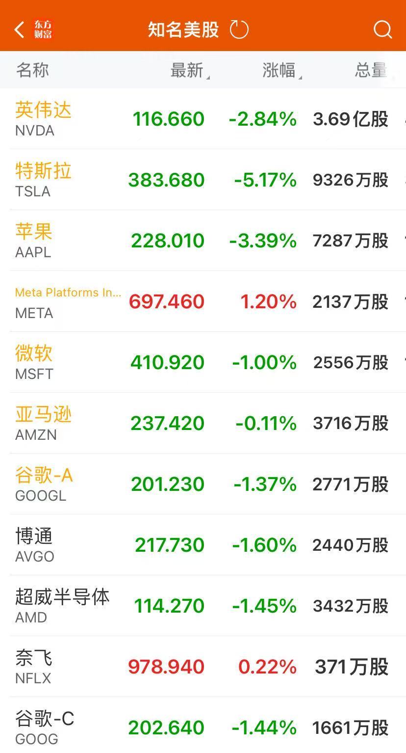 大型科技股多数下跌,特斯拉跌超5%,一夜蒸发670亿美元(约合人民币4900亿元),苹果跌逾3%,谷歌跌逾1%,微软、亚马逊小幅下跌;Meta涨超1%,奈飞小幅上涨。芯片股普跌,英伟达跌近3%,超微电脑跌近6%,台积电跌超4%,安森美半导体跌近4%,ARM、博通、高通、阿斯麦跟跌。