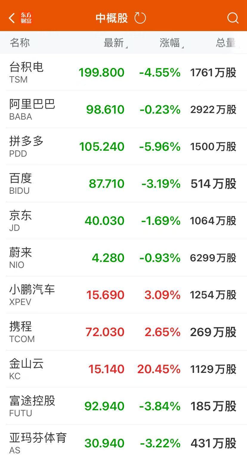 其中,科技股多数下跌,特斯拉跌超5%,苹果跌逾3%,英伟达跌近3%;中概股多数下跌,拼多多跌超5%,金山云逆势涨超20%。