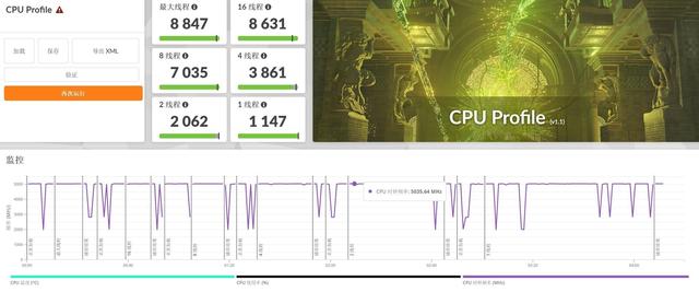 3DMark CPU Profile测试标准,AMD锐龙AI 9 365处理器单线程得分1147,2线程得分2062,4线程得分3861,8线程得分7035,16线程得分8631,最大线程得分8847,整体性能释放相当可观。