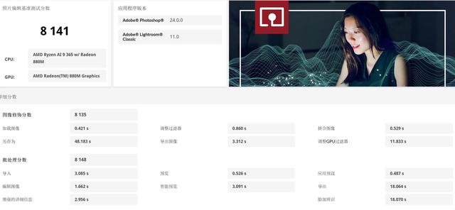 接下来看看UL Procyon的照片编辑和视频编辑测试。使用Photoshop和Lightroom对照片进行批处理,ThinkBook 16+ 2025 锐龙AI元启版综合得分可以达到8141分,表现出色。