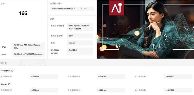 通过UL Procyon测试可以看到,Windows ML CPU整数计算评分达到了166分,相对锐龙8040系列来说几乎翻倍。Windows ML GPU float16浮点算力评分343分,整体性能也有相当的提升。