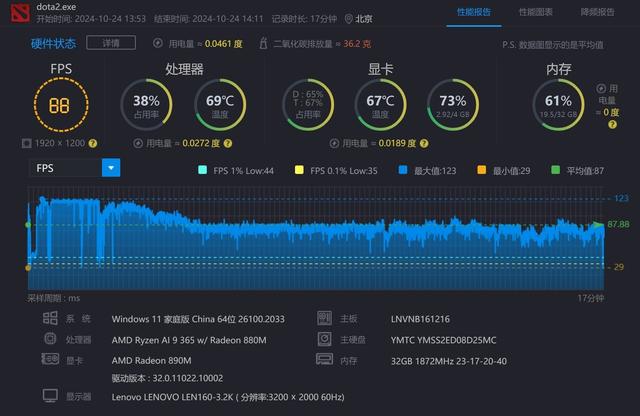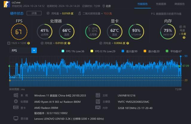 在电竞游戏方面,《CS2》、《DOTA2》两款游戏在1920x1080分辨率、最高画质下,平均帧数分别达到67fps和88fps,流畅运行无压力,完全可以满足用户玩电竞游戏或网游的需求。