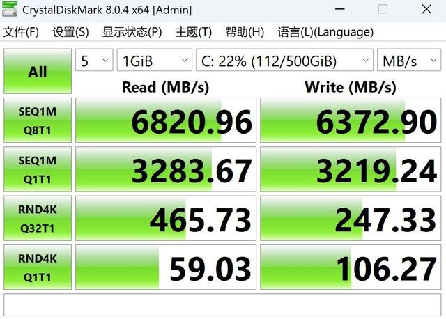 这款产品还配置了一块1TB PCIe 4.0固态硬盘,并预留了额外的M.2 2280盘位给到用户升级。实测Q8T1顺序读取速度6820.96MB/s,写入速度6372.9MB/s,4KQ1T1随机读取速度为59.03MB/s,写入速度为106.27MB/s,读写速度极佳。可以为软件加载、AI大模型加载、大容量数据读写提速。