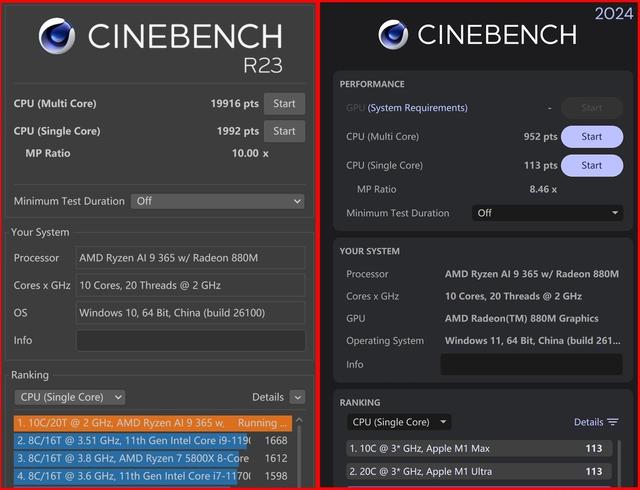 老规矩,我们还是先来看CINEBENCH R23和2024的测试。在CINEBENCH R23测试标准下,这颗处理器单核得分1992,多核得分19916;CINEBENCH 2024单核得分113,多核得分952,整体性能要略高于28W功耗的锐龙AI 9 HX 370,低于80W的锐龙AI 9 HX 370。可见,ThinkBook 16+ 2025 锐龙AI元启版在功耗释放上相当激进。