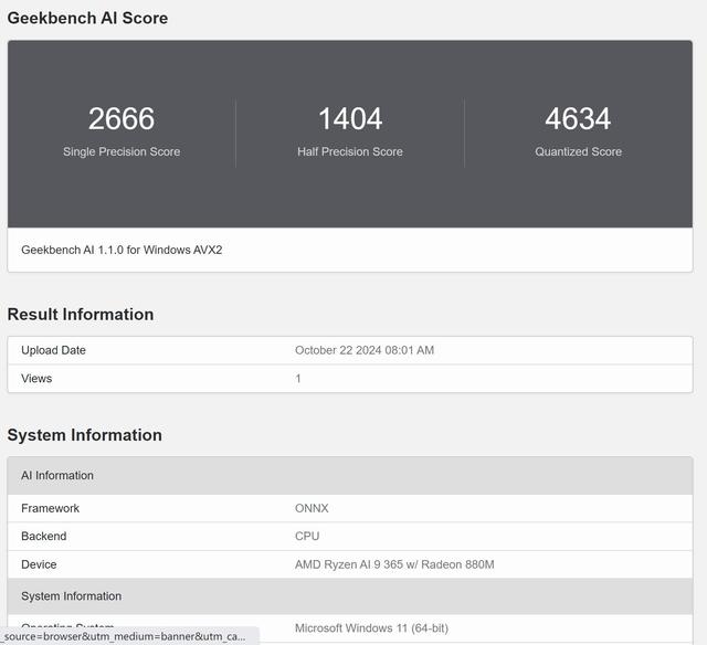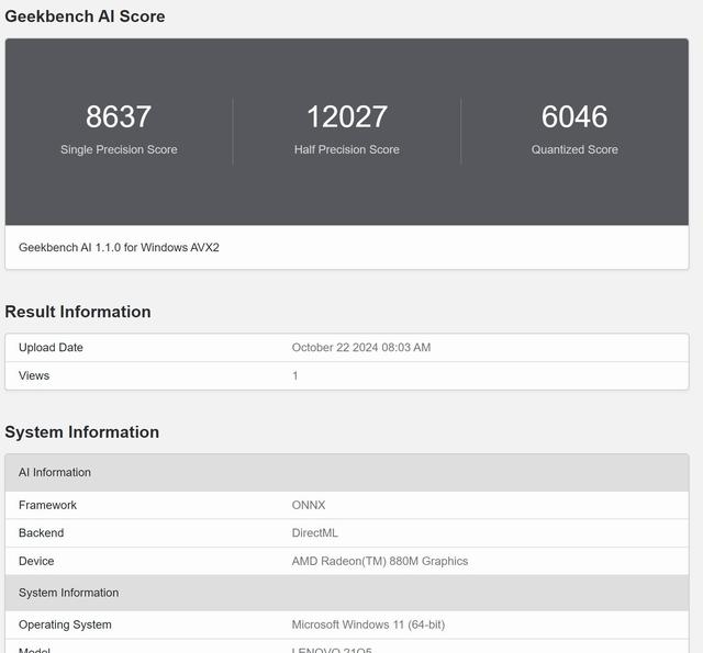 另外我们还参考了全新的Geekbench AI测试,以了解CPU和GPU在单精度、半精度、量化方面的表现。从测试结果可知,锐龙AI 9 365处理器的CPU单精度性能评分2666,半精度性能评分1404,量化评分4634;Radeon 880M iGPU在ONNX框架下,单精度性能评分8637,半精度性能评分12027,量化评分6046,整体AI性能表现还是相当不错的。