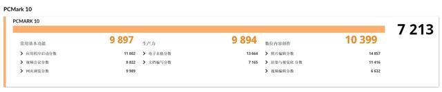 得益于锐龙AI 9 365处理器出色的性能释放,ThinkBook 16+ 2025 锐龙AI元启版应对生产力应用自然是游刃有余。PCMark10办公模式,这款产品在常用基本功能方面得分9897,生产力性能评分9894,数位内容创作方面得分10399,综合得分7213,整体表现不错。日常Office办公、图片、视频处理等等都有不错的效率保障。