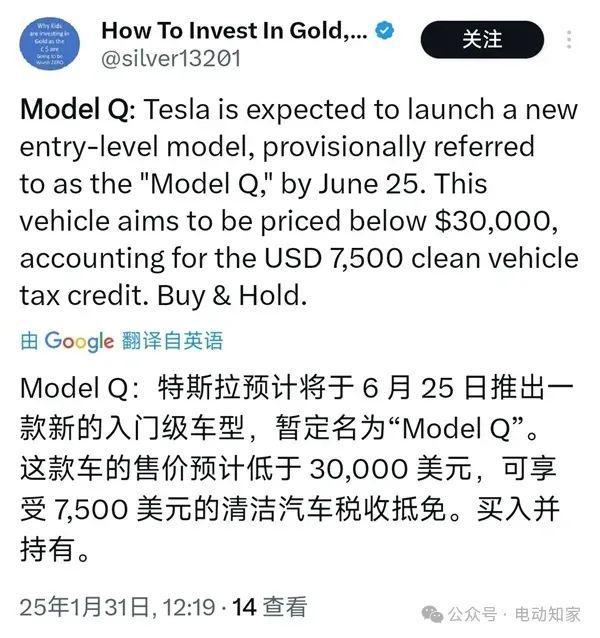 电动知家消息,近日有海外博主爆料,特斯拉全新入门纯电动车Model Q将于今年6月25日发布,预计售价低于30000美元,并且在美国还可享受7500美元的免税政策。