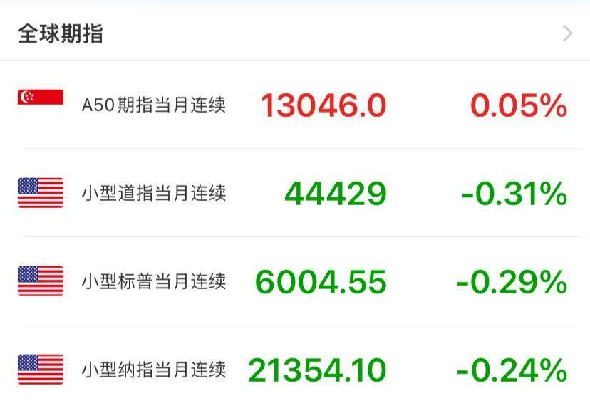 截至发稿,道指期货跌约0.31%,标普500期货跌约0.29%,纳指期货跌约0.24%。
