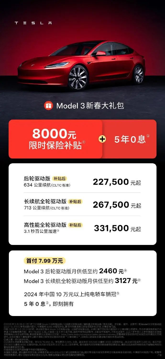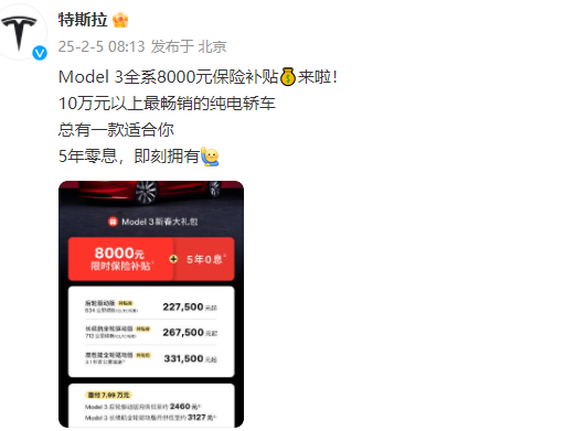 据特斯拉官微2月5日消息,Model 3全系8000元保险补贴今日上线,同时还拥有5年零息政策。