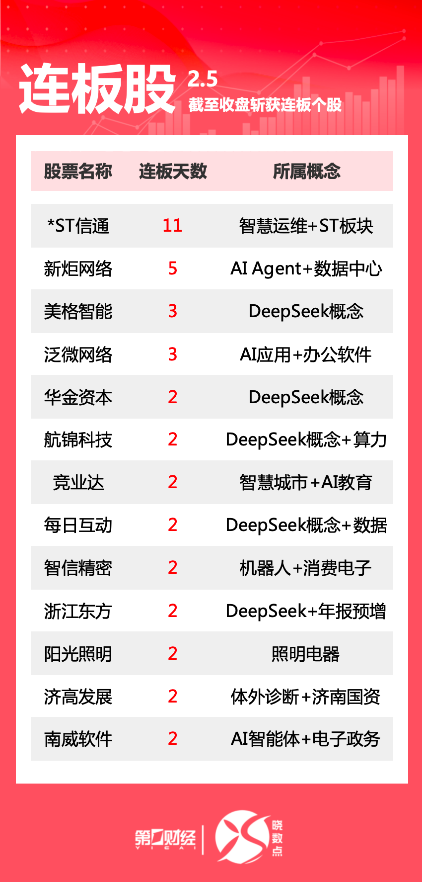 AI概念股新炬网络5连板,DeepSeek概念股美格智能收获3连板。