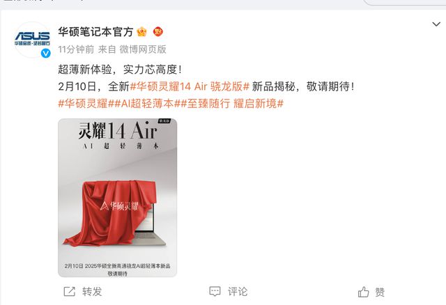 华硕灵耀 14 Air 骁龙版更轻薄、续航更持久,AI 算力强大同时搭载 AI 智能助手软件“小硕知道”,为注重高品质生活、追求时尚设计的移动办公人士带来全新移动办公体验。2 月 10 日,敬请关注新品首发开箱直播!
