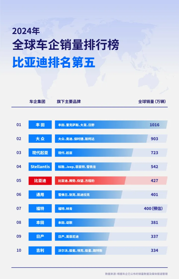 其中 2024 年横扫主流价位新能源市场的比亚迪,以 427 万辆的成绩跻身全球第五,成功超越美国两大巨头通用福特,距离第四名 Stellantis 还有 115 万的差距。