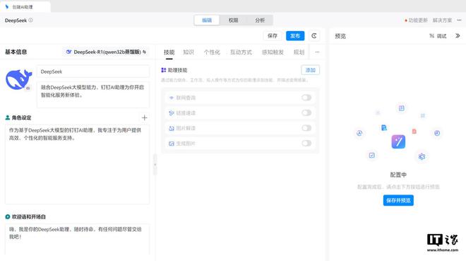 IT之家 2 月 7 日消息,钉钉 AI 助理现已全面接入 DeepSeek 系列模型,用户可自主选择 DeepSeek 系列的 R1(671B 满血版及 qwen32b 蒸馏版)、V3(671B 满血版)共 3 种模型。同时,钉钉还发布了全新模板,帮助用户一键创建、发布基于 DeepSeek 模型的 AI 助理,无需配置。