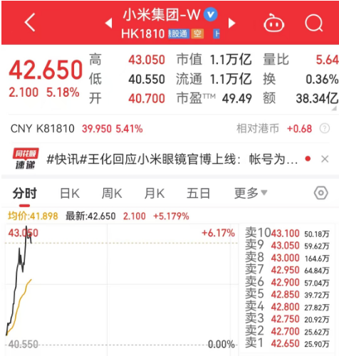 图片来源:雷军微博港股小米集团-W(HK1810)直线拉升,股价再创历史新高,年初以来已涨超24%。截至发稿,小米集团-W涨5.18%。报42.65港元,市值1.1万亿港元。