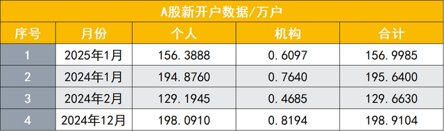 根据上交所披露的《股票账户新开户状况表》,2025年1月A股市场个人新开户数环比2024年12月的198.0910万户下降约21%,同比去年1月下降19.74%,这其中一个重要因素在于2025年春节假期部分在1月。春节假期是一个重要影响因素,去年2月的129.1945万户开户就是一个相对低位。