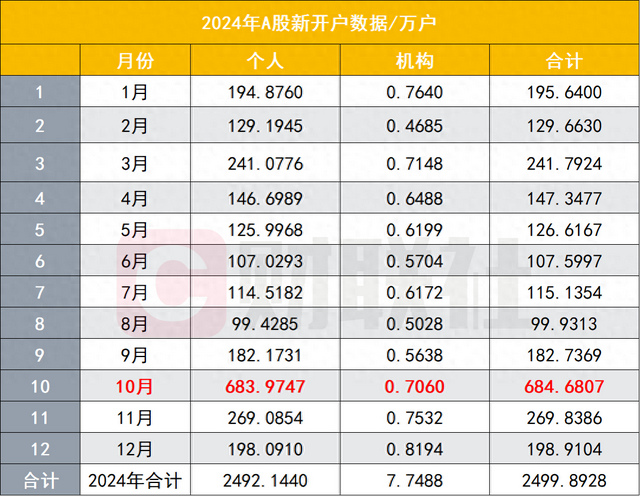 回顾2024年,A股新开户数据呈现明显的“波浪式”特征。从全年来看,个人投资者新开A股账户累计达2492.1440万户,机构账户7.7488万户,其中,2024年10月个人开户数飙升至683.9747万户,单月数据远超其他月份,成为全年最大亮点。