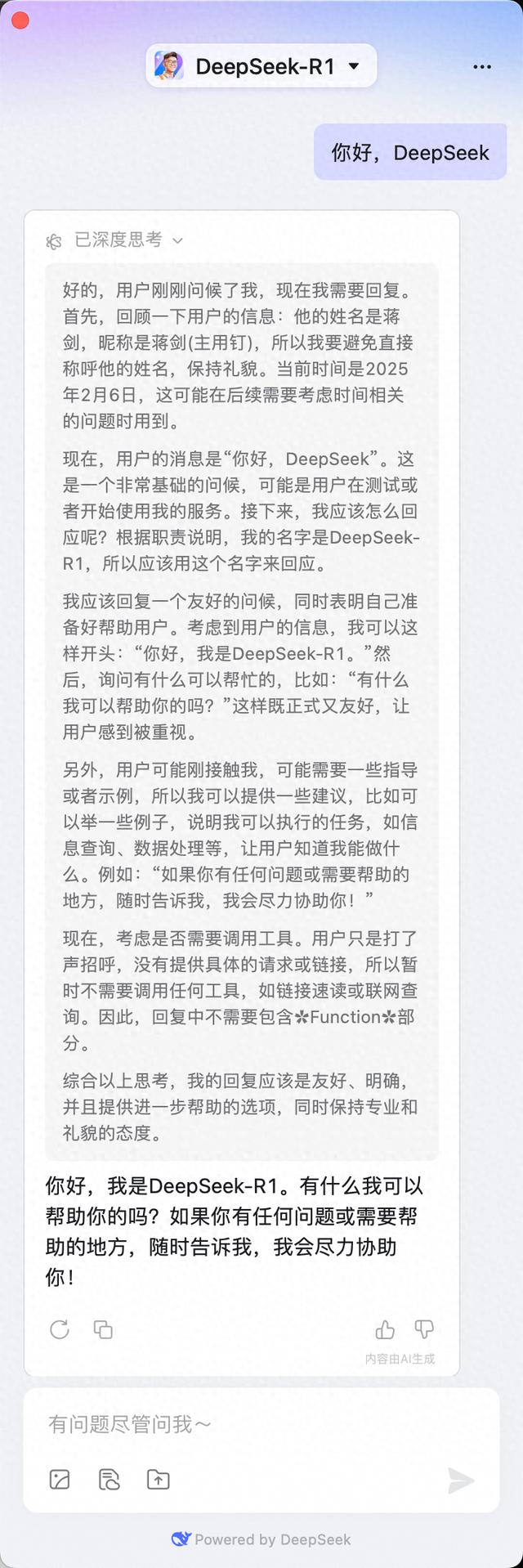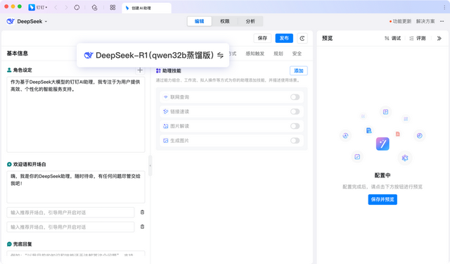 2月6日,观察者网获悉,钉钉AI助理已经全面接入DeepSeek系列模型。用户在钉钉上创建AI助理时,可自主选择DeepSeeK系列的R1、V3等3种模型。同时,钉钉还发布了全新模板,帮助用户一键创建、发布基于DeepSeeK模型的AI助理。