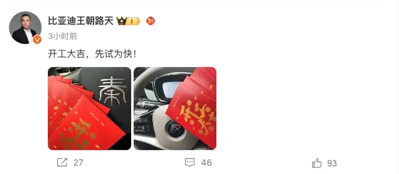 近日,比亚迪王朝网销售事业部总经理路天晒出“开工大吉”微博。根据发布的图片,我们看到秦家族和汉家族车型方向盘配备了“智驾”拨片,且红包封面集结了夏、秦、汉、唐、宋、元全系IP。